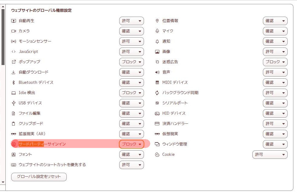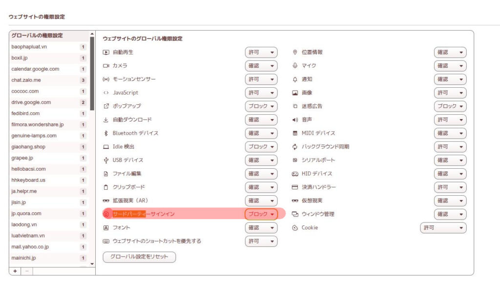 PCの場合:ウェブサイトのグローバル権限設定 →「サードパーティサインイン」を無効にするだけです。 Andridスマホの場合:設定→コンテンツ設定→サイトの設定から「サードパーティのログイン」をブロックしてください。 うむ、快適。