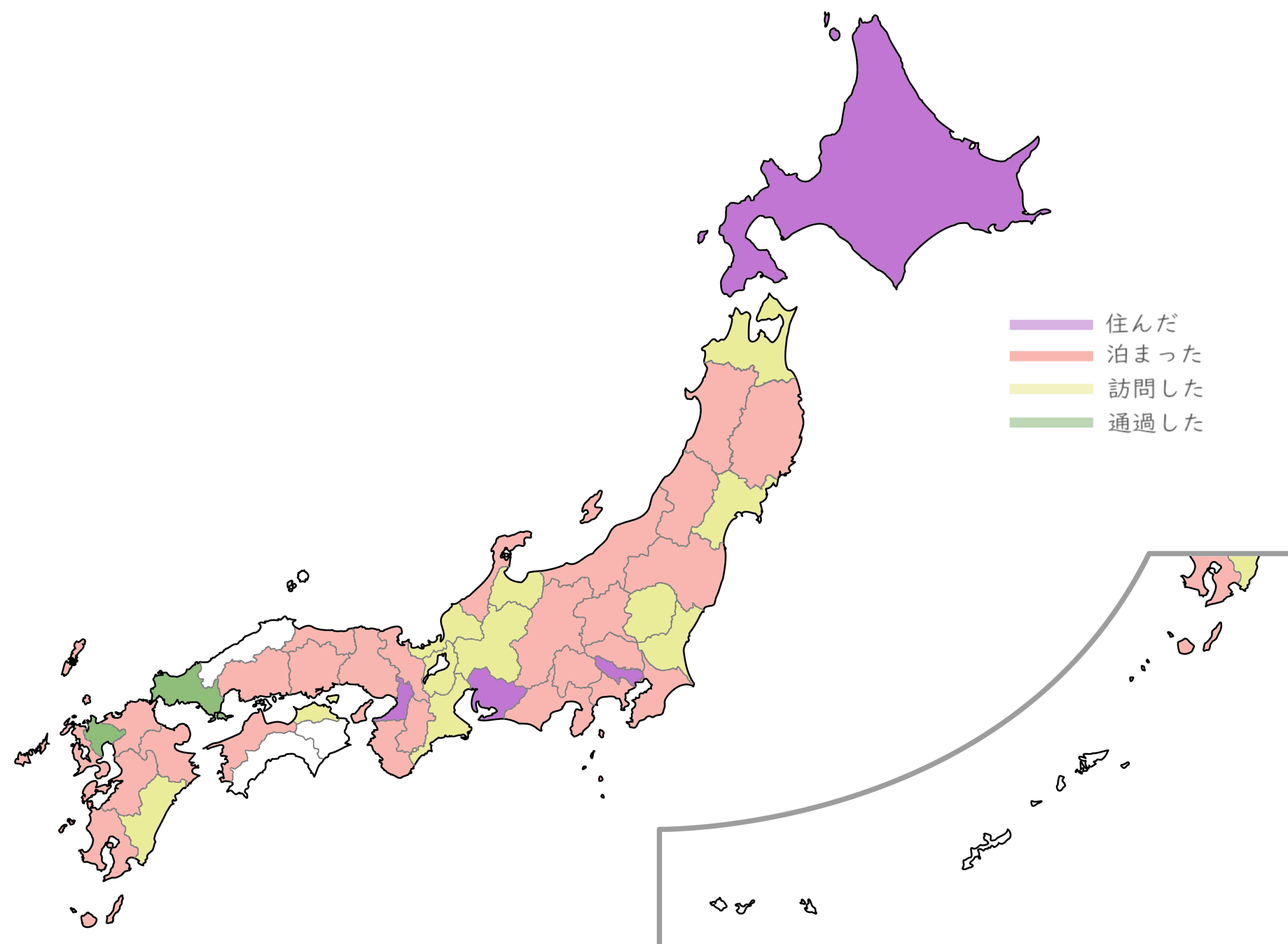 宿泊済み5市40省、訪問済み11省、通過のみ2省、未踏5省